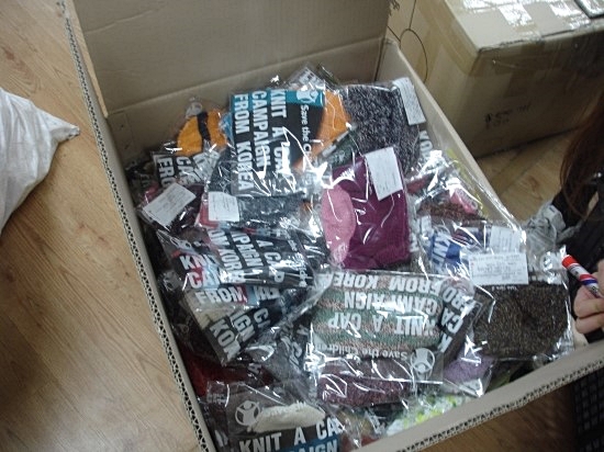 박스들 중에서 박스 안에 모자 450개가